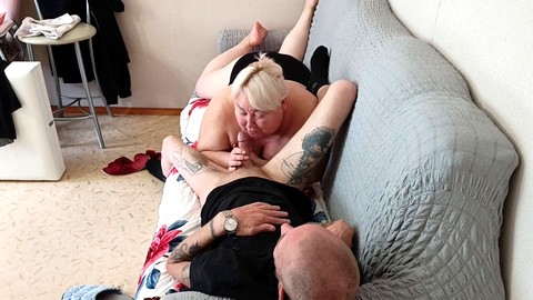 Hot platinum-blonde TS records a home movie as her boyfriend blows her and finishes in his mouth