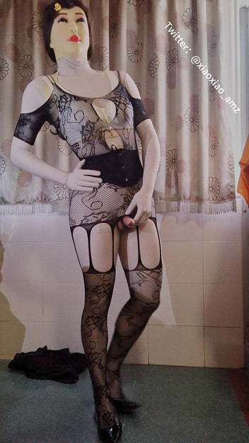 Transvestite Ah Qi "cute Shemale in Wide Sweater and Duck Shoes in Public Toilet"