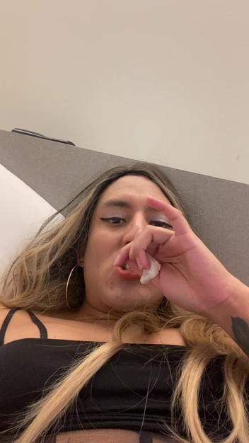 Freaky tranny teen Canela loves to lick cum out of condoms while jerking off and cum